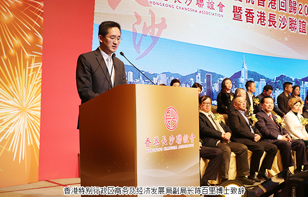 香港特區(qū)商務(wù)及經(jīng)濟(jì)發(fā)展局副局長(zhǎng)陳百里致辭中對(duì)香港長(zhǎng)沙聯(lián)誼會(huì)成立一周年表示祝賀。香港與長(zhǎng)沙兩地的合作在過(guò)去已取得豐碩成果,香港不僅是湖南的第一大外資來(lái)源地,也是湖南對(duì)外出口的第一大市場(chǎng),2016年,在湖南省的港資企業(yè)比2015年增加超過(guò)25%,合同投資同比增長(zhǎng)接近90%,實(shí)際使用投資同比增長(zhǎng)20%。 去年5月,特區(qū)政府在湖南省開(kāi)設(shè)了聯(lián)絡(luò)處,這個(gè)安排有助推動(dòng)湖南和香港兩地在經(jīng)貿(mào)、文化等方面的交流和合作,并為在湖南工作、讀書(shū)和生活的港人提供更合適的服務(wù)。陳百里認(rèn)為,兩地未來(lái)在經(jīng)貿(mào)、創(chuàng)新科技、專(zhuān)業(yè)服務(wù)、文化產(chǎn)業(yè)等方面有很大的合作空間。期望湖南湘友繼續(xù)利用香港多方面的平臺(tái)和優(yōu)勢(shì),與香港企業(yè)和專(zhuān)業(yè)服務(wù)公司“并船出?!保_(kāi)拓國(guó)際市場(chǎng),為兩地創(chuàng)造商機(jī),達(dá)致互惠共贏。