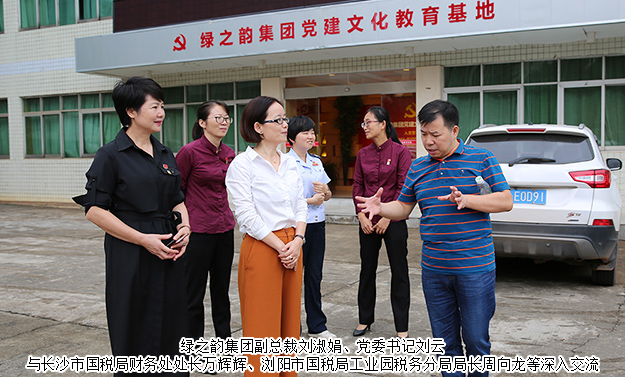 為進一步推動“兩學(xué)一做”學(xué)習(xí)教育常態(tài)化、制度化,2017年9月28日,長沙市國稅局財務(wù)處處長萬輝輝、副處長張翼翔,瀏陽市國稅局工業(yè)園稅務(wù)分局局長周向龍、副局長陳朝陽、李柯平、李學(xué)東等一行蒞臨綠之韻集團參觀,與綠之韻集團黨委第五支部開展主題黨日交流活動。綠之韻集團副總裁劉淑娟、黨委書記劉云,集團第五支部書記程芳等陪同參觀。