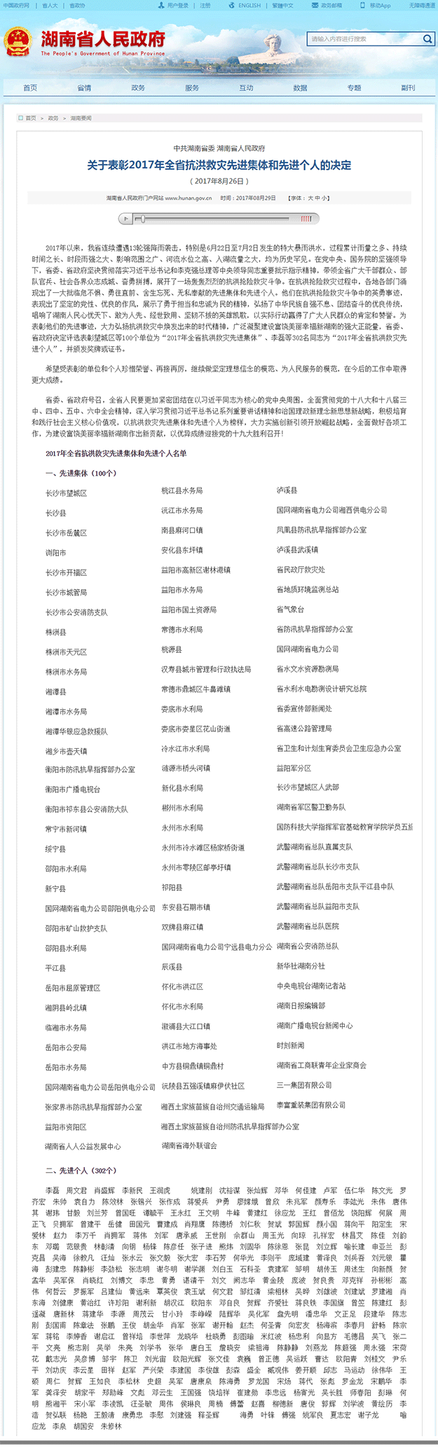 2017年8月28日,湖南省抗洪救災(zāi)總結(jié)大會(huì)在長(zhǎng)沙召開,回顧總結(jié)抗洪救災(zāi)工作,表彰先進(jìn)集體和先進(jìn)個(gè)人,激勵(lì)全省廣大干部群眾弘揚(yáng)抗洪精神,大力實(shí)施創(chuàng)新引領(lǐng)開放崛起戰(zhàn)略,為加快建設(shè)富饒美麗幸福新湖南而努力奮斗。中共湖南省委書記、省人大常委會(huì)主任杜家毫,中共湖南省委副書記、省長(zhǎng)許達(dá)哲出席會(huì)議并講話。會(huì)上,湖南省人民政府副省長(zhǎng)楊光榮宣讀了《中共湖南省委湖南省人民政府關(guān)于表彰2017年全省抗洪救災(zāi)先進(jìn)集體和先進(jìn)個(gè)人的決定》,100個(gè)單位被授予“2017年全省抗洪救災(zāi)先進(jìn)集體”、302名同志被授予“2017年全省抗洪救災(zāi)先進(jìn)個(gè)人”,并頒發(fā)獎(jiǎng)牌或證書。綠之韻集團(tuán)董事長(zhǎng)胡國(guó)安被光榮授予“2017年全省抗洪救災(zāi)先進(jìn)個(gè)人”榮譽(yù)稱號(hào)。