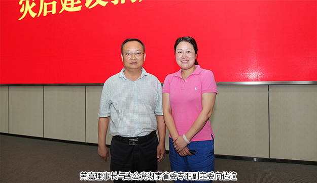 2017年7月12日,湖南統(tǒng)一戰(zhàn)線支持寧鄉(xiāng)災(zāi)后建設(shè)捐贈活動在寧鄉(xiāng)舉行,中共湖南省委統(tǒng)戰(zhàn)部常務(wù)副部長譚平,湖南省政協(xié)副秘書長、辦公廳主任許石林,中共湖南省委統(tǒng)戰(zhàn)部副部長、湖南省工商聯(lián)黨組書記陳瀟,湖南省政協(xié)港澳臺僑和外事委員會主任陳益枝,中共湖南省委統(tǒng)戰(zhàn)部巡視員符俊根,湖南省工商聯(lián)黨組成員、副主席肖翔,中共長沙市委副書記徐宏源,中共長沙市委常委、統(tǒng)戰(zhàn)部部長譚小平等領(lǐng)導(dǎo)出席活動。湖南省政協(xié)委員、湖南省工商聯(lián)(總商會)副會長、致公黨湖南省委員會電商委員會主任、綠之韻集團(tuán)董事長胡國安因事未能來到現(xiàn)場,特別委托綠之韻集團(tuán)董事總裁、綠之韻公益基金會理事長勞嘉參加活動,并再次捐資20萬元支持寧鄉(xiāng)災(zāi)后建設(shè)。