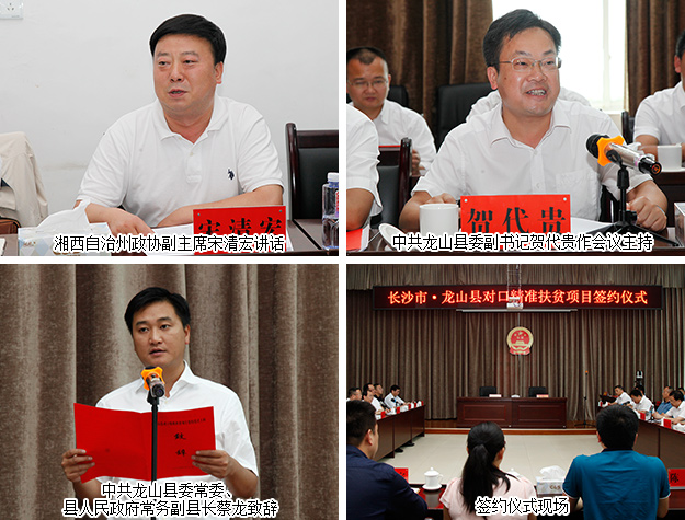 長(zhǎng)沙市政協(xié)主席文樹(shù)勛在簽約儀式上作重要講話,他指出:近年來(lái),為貫徹國(guó)家“精準(zhǔn)扶貧、精準(zhǔn)脫貧”戰(zhàn)略思想,全面落實(shí)中央和省委省政府部署要求,長(zhǎng)沙市委市政府以及市直部門(mén)主要負(fù)責(zé)同志,先后數(shù)次專程赴龍山縣開(kāi)展對(duì)口幫扶工作,特別是省會(huì)城市的企業(yè)家們,致富不忘回報(bào)社會(huì),心系龍山脫貧發(fā)展,龍山經(jīng)濟(jì)社會(huì)發(fā)展取得了長(zhǎng)足的進(jìn)步、城鄉(xiāng)居民收入發(fā)生了翻天覆地的變化,龍山縣精準(zhǔn)脫貧指日可待。他提出了下一步龍山縣茨巖塘鎮(zhèn)的精準(zhǔn)扶貧工作三點(diǎn)要求:一是要抓好產(chǎn)業(yè)扶持,要把長(zhǎng)沙的資金、技術(shù)、管理優(yōu)勢(shì)和茨巖塘鎮(zhèn)的資源稟賦和產(chǎn)業(yè)特色結(jié)合對(duì)接起來(lái),扶持一批生態(tài)、文化、民俗產(chǎn)業(yè);二是要抓好項(xiàng)目援建,要突出民生重點(diǎn),解決鄉(xiāng)民的衣食住行首要問(wèn)題;三是要抓好教育培訓(xùn),扶貧先扶志,多舉辦龍山農(nóng)民致富培訓(xùn)班、加強(qiáng)技術(shù)人員現(xiàn)場(chǎng)指導(dǎo),提高農(nóng)戶種養(yǎng)殖水平,為農(nóng)山人民脫貧致富提供智力支持。