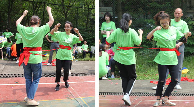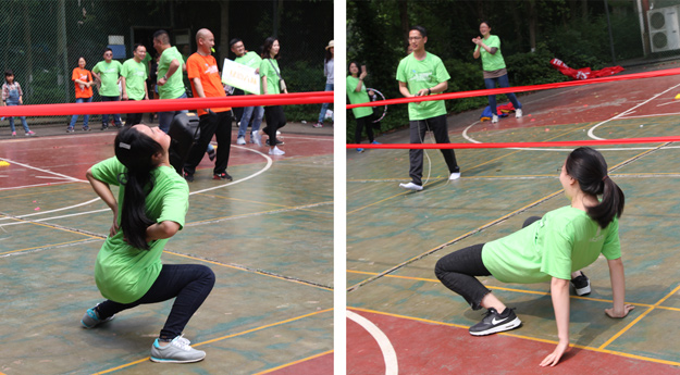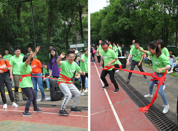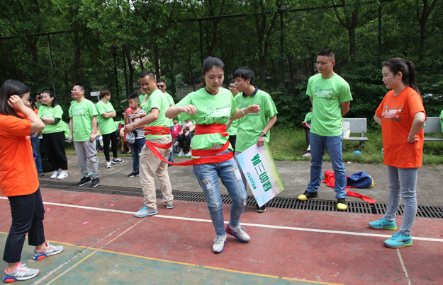 稍作整理后,活動組委會將所有參加活動的員工分成了六組,在六個小組間展開了別開生面、妙趣橫生的趣味競技活動。比賽還沒開始,各隊成員就摩拳擦掌,躍躍欲試?!按筇庇螒蛑?,家人們穿著“袋鼠裝”,哨聲一響,參賽隊員們使出了渾身解數(shù),有的步伐輕盈輕松而過,有的奮力跳躍磕磕絆絆,有的手忙腳亂摔倒在地……參賽的家人縱情投入,場邊的助威吶喊聲連同歡笑聲此起彼伏,不絕于耳,將活動推向一個又一個的高潮。