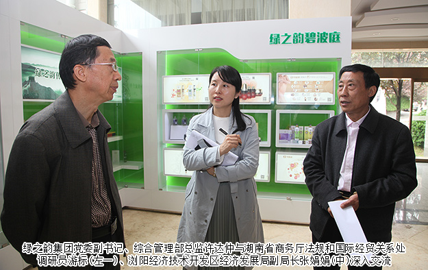 在深入親切的交談中,瀏陽經(jīng)濟技術開發(fā)區(qū)經(jīng)濟發(fā)展局副局長張娟娟表示:作為瀏陽經(jīng)濟技術開發(fā)區(qū)代表企業(yè),綠之韻集團不僅高度重視產(chǎn)品品質,規(guī)范企業(yè)管理,深耕企業(yè)文化,在利稅、創(chuàng)業(yè)就業(yè)、“三農(nóng)”建設、黨團工作、公益事業(yè)等方面的貢獻尤為突出。湖南省商務廳法規(guī)和國際經(jīng)貿(mào)關系處調(diào)研員游標指出:目前湖南省商務廳為宣傳、推介我省企業(yè)和產(chǎn)品,促進企業(yè)“走出去”和產(chǎn)品的進出口,正在布置援外培訓工作。綠之韻集團是湖南本土知名企業(yè),積極拓展海外市場,軟硬件設施也較為齊備,未來或將作為“中國對外援助培訓湖南實訓基地”供學員對接,為湖南開放型經(jīng)濟發(fā)展架橋拓市貢獻力量。