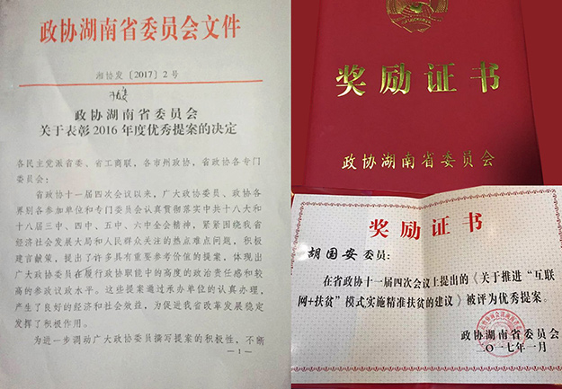 會(huì)議聽取了湖南省政協(xié)副主席賴明勇代表十一屆省政協(xié)常委會(huì)所作的關(guān)于十一屆四次會(huì)議以來提案工作情況的報(bào)告。會(huì)議還表彰了112名優(yōu)秀政協(xié)委員和41件優(yōu)秀提案,胡國(guó)安委員《關(guān)于推進(jìn)“互聯(lián)網(wǎng)+扶貧”模式,實(shí)施精準(zhǔn)扶貧的建議》被政協(xié)湖南省委員會(huì)授予“優(yōu)秀提案”,湖南省政協(xié)副主席楊維剛宣讀了表彰決定。