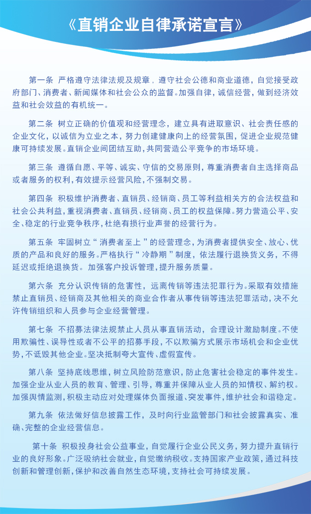 出席研討會的國家工商總局副局長王江平指出,維護好直銷行業(yè)的聲譽,既是每個直銷企業(yè)的職責(zé),也是政府監(jiān)管部門的職責(zé)。他強調(diào),直銷行業(yè)要堅持底線思維,確保不涉?zhèn)麂N、不涉“金字塔”欺詐、不引發(fā)社會群體性事件。同時,堅持誠信為本,努力營造更加便利、更加符合互聯(lián)網(wǎng)時代特征的直銷經(jīng)營環(huán)境。要堅持消費者至上,嚴(yán)格執(zhí)行退換貨制度,切實把保護消費者權(quán)益放在更加突出的位置。要堅持科學(xué)監(jiān)管,有效監(jiān)管,倡導(dǎo)直銷行業(yè)自律機制,努力形成社會共治格局,防止劣幣驅(qū)逐良幣,促進直銷行業(yè)穩(wěn)定健康發(fā)展。