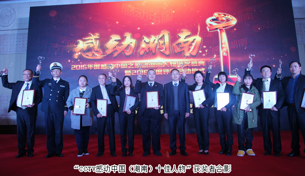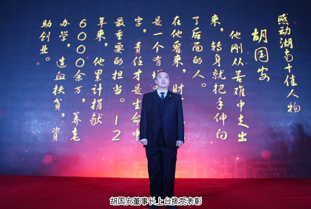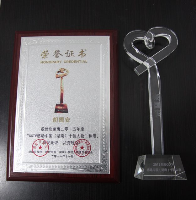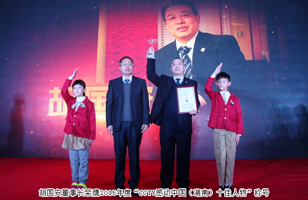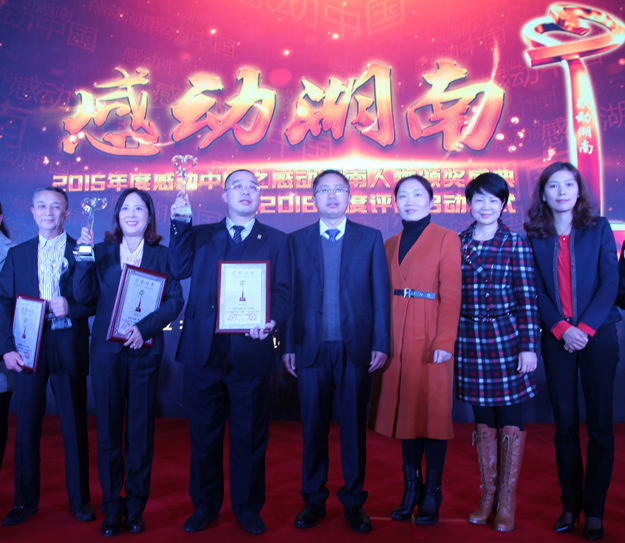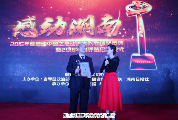 感動(dòng)中國,感動(dòng)湖南。2016年11月9日,由湖南省文明辦指導(dǎo),湖南日報(bào)社、省總工會、省軍區(qū)政治部、團(tuán)省委、省婦聯(lián)共同主辦,三湘都市報(bào)、華聲在線承辦的“2015年度感動(dòng)中國之感動(dòng)湖南人物”頒獎(jiǎng)典禮在湖南省委九所賓館隆重舉行。湖南省人大常委會副主任李友志,省人大常委會委員、教科文衛(wèi)委員會主任委員梁爾源,中共湖南省委宣傳部副部長、省文明辦主任劉進(jìn)能,省總工會黨組成員、副主席黃新民,省婦聯(lián)黨組成員、副主席魯華,湖南日報(bào)社黨組成員、副總編輯鄧獻(xiàn)忠,省軍區(qū)轉(zhuǎn)業(yè)辦主任吳湘波,省委宣傳部新聞處處長馮錦,省文明辦創(chuàng)建處處長張志輝,湖南日報(bào)社編委、三湘都市報(bào)總編輯、華聲在線常務(wù)副總裁張?jiān)茐?,省總工會宣教部副部長羅偉,共青團(tuán)湖南省委宣傳部部長陳麗等出席活動(dòng)。綠之韻集團(tuán)董事長胡國安獲評2015年度“CCTV感動(dòng)中國(湖南)十佳人物”稱號,中共湖南省委宣傳部副部長、省文明辦主任劉進(jìn)能為胡國安董事長頒獎(jiǎng)。