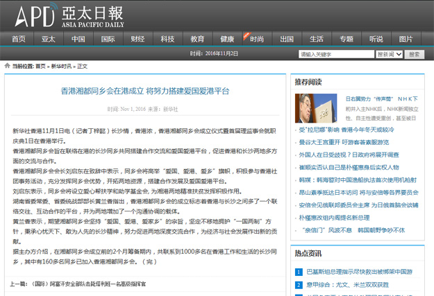 2016年11月1日,湖南香港湘都同鄉(xiāng)會在香港北角海逸君綽酒店成立。同鄉(xiāng)會號召居港老鄉(xiāng)團結(jié)一心,共創(chuàng)美好未來。會上,來自香港的200多名湖南老鄉(xiāng)匯聚一堂,共暢友誼,共謀未來。