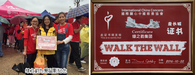 “走長(zhǎng)城”公益活動(dòng)是國(guó)際關(guān)心中國(guó)慈善協(xié)會(huì)(簡(jiǎn)稱ICC)創(chuàng)始人英國(guó)義工高永恩先生從2007年發(fā)起的,每年的金秋在加拿大、澳大利亞、英國(guó)、美國(guó)、新加坡、法國(guó)、愛爾蘭、荷蘭、中國(guó)香港、長(zhǎng)沙、衡陽、三門峽的愛心義工們攜手為孤殘兒童行走。通過活動(dòng)籌集善款幫助有需要的孤殘兒童,讓孩子們有新的家,有愛、希望和機(jī)會(huì)。自2014年初,綠之韻集團(tuán)與ICC和孩子們結(jié)緣,胡國(guó)安董事長(zhǎng)、勞嘉執(zhí)行總裁每年多次帶隊(duì)看望孩子們,并捐贈(zèng)善款用于ICC湖南的孤殘兒童合作項(xiàng)目。
