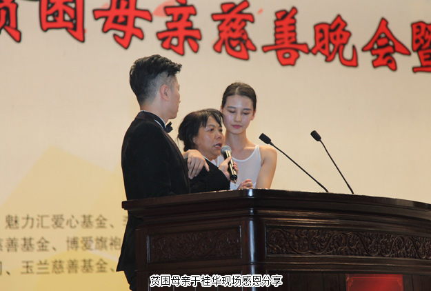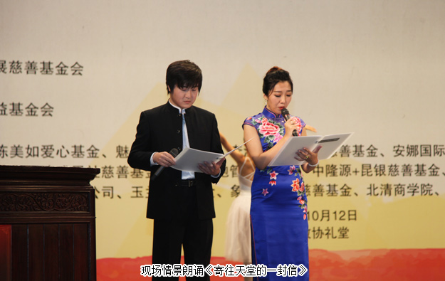 晚會現(xiàn)場情景朗誦《寄往天堂的一封信》讓現(xiàn)場觀眾凄然淚下。故事是根據(jù)吉林省貧困母親于桂華女士和女兒得大病至到女兒病逝的真實事件,在北京求助過程中得到了“關愛貧困母親”項目的大力幫助。于桂華來的現(xiàn)場,她說目前最大的愿望就是回報社會,感恩幫助過的好心人。
