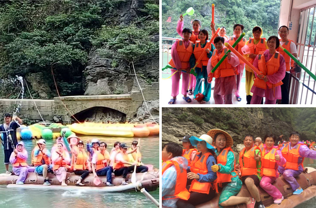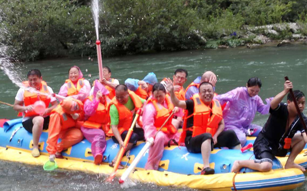 第二站,綠之韻的家人們前往素有“天下第一漂”美譽(yù)的猛洞河漂流,感受與水搏斗的激情和清涼。水槍、水瓢、雨衣等打水仗的“武器”裝備齊全,只見河中水花飛舞、水柱橫飛,還未坐上船伙伴們就紛紛“濕身”了。拐一百五十五個(gè)彎,在一百三十三個(gè)灘潭中穿梭而行,途徑三角巖、雞籠門、落水坑瀑布、夢(mèng)思峽……綠之韻家人順流而下,在這里放歌長(zhǎng)嘯,戲水嘻鬧,找回快樂的自我。