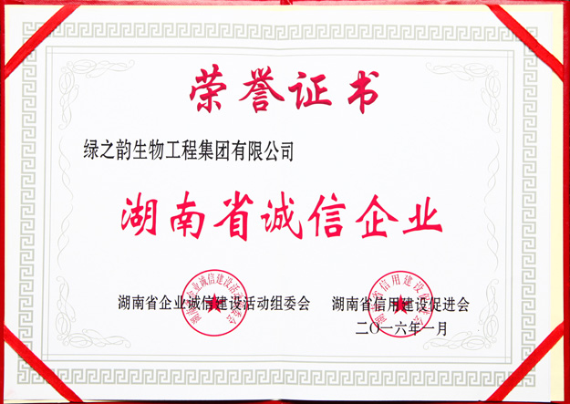 為樹立誠信標(biāo)桿,弘揚(yáng)誠信精神,推動(dòng)我省誠信體系建設(shè),營造良好信用環(huán)境,在中共湖南省委宣傳部、湖南省工商行政管理局的支持和指導(dǎo)下,經(jīng)過湖南省企業(yè)誠信建設(shè)活動(dòng)組委會(huì)和專家組歷時(shí)6個(gè)多月的嚴(yán)格評(píng)審及聲譽(yù)監(jiān)測,本著科學(xué)、務(wù)實(shí)、規(guī)范和公正、公平、公開的原則,綠之韻集團(tuán)被湖南省企業(yè)誠信建設(shè)活動(dòng)組委會(huì)、湖南省信用建設(shè)促進(jìn)會(huì)聯(lián)合評(píng)定為“湖南省誠信企業(yè)”和“湖南省質(zhì)量服務(wù)百強(qiáng)品牌”。