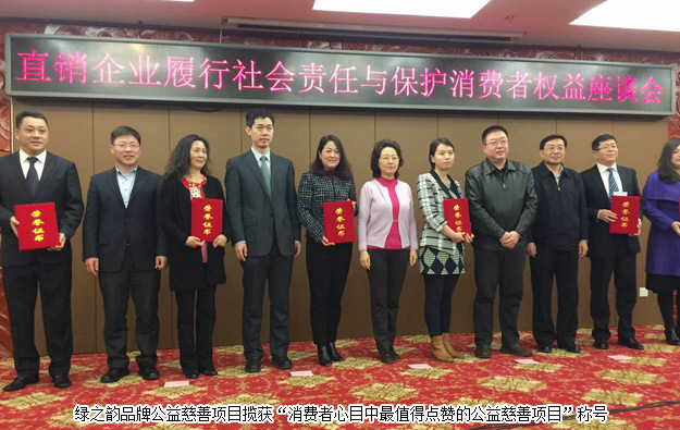 2016年3.15前夕,由中國(guó)消費(fèi)者報(bào)社、中國(guó)消費(fèi)網(wǎng)主辦的3·15直銷企業(yè)履行社會(huì)責(zé)任與保護(hù)消費(fèi)者權(quán)益座談會(huì)在北京召開(kāi)。國(guó)家工商總局競(jìng)爭(zhēng)執(zhí)法局副局長(zhǎng)白京華、國(guó)家工商總局消費(fèi)者權(quán)益保護(hù)局副局長(zhǎng)黃建華、國(guó)家工商總局反壟斷與反不正當(dāng)競(jìng)爭(zhēng)執(zhí)法局直銷監(jiān)管處處長(zhǎng)張衛(wèi)明、商務(wù)部市場(chǎng)秩序司法規(guī)處處長(zhǎng)吳鳳武、中國(guó)消費(fèi)者協(xié)會(huì)副會(huì)長(zhǎng)兼秘書(shū)長(zhǎng)常宇、《中國(guó)消費(fèi)者報(bào)》社長(zhǎng)朱劍橋,以及省市工商和市場(chǎng)監(jiān)管部門相關(guān)業(yè)務(wù)負(fù)責(zé)人出席了本次座談會(huì)。綠之韻集團(tuán)董事執(zhí)行總裁勞嘉應(yīng)邀出席會(huì)議,并擔(dān)任會(huì)議小組討論主持人。綠之韻集團(tuán)“關(guān)愛(ài)貧困母親救助項(xiàng)目”和“樹(shù)人行動(dòng)公益慈善項(xiàng)目”攬獲“消費(fèi)者心目中最值得點(diǎn)贊的優(yōu)秀公益慈善項(xiàng)目"榮譽(yù)稱號(hào)。