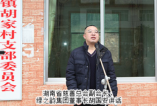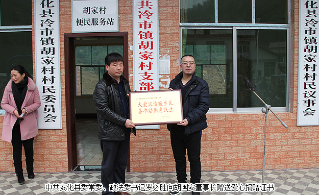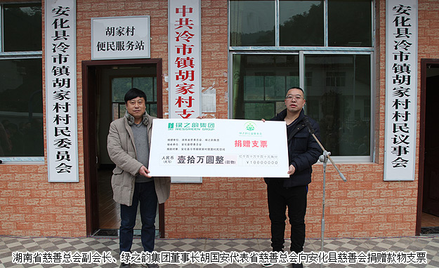 愛心慰問活動(dòng)上,對胡國安董事長致富思源、支援家鄉(xiāng)建設(shè)的高尚情操,對綠之韻集團(tuán)精準(zhǔn)扶貧、回報(bào)桑梓的大愛情懷表示高度的肯定和贊許;安化縣冷市鎮(zhèn)胡家村村支書胡利民簡單介紹了胡家村相關(guān)情況。湖南省慈善總會副會長、綠之韻集團(tuán)董事長胡國安代表湖南省慈善總會向安化縣慈善會捐贈(zèng)10萬元款物支票,中共安化縣委常委、政法委書記羅必勝向胡國安董事長頒發(fā)了愛心捐贈(zèng)證書。儀式上,湖南省慈善總會副會長、綠之韻集團(tuán)董事長胡國安發(fā)表了飽含真情的講話。他在發(fā)言中表示,“一個(gè)企業(yè)能夠受到政府的關(guān)心、贏得社會的信賴,獲得民眾的尊重,一定離不開對社會責(zé)任的思考、實(shí)踐和擔(dān)當(dāng)。安化胡家村是我的家鄉(xiāng),生我養(yǎng)我的熱土,生命之源,難忘之根。沒有胡家村,就沒有我,沒有綠之韻。我從這里的大山走出去,也想幫助更多人走出大山,過上幸福快樂的生活。綠之韻公益基金會除了繼續(xù)幫扶家鄉(xiāng)建設(shè)水、電、道路和學(xué)校等基礎(chǔ)設(shè)施,還將進(jìn)一步推動(dòng)輸血式扶貧向造血式、“互聯(lián)網(wǎng)+三農(nóng)”扶貧模式轉(zhuǎn)變,盡最大努力幫助解決安化扶貧的實(shí)際困難,幫助家鄉(xiāng)困難群眾建立脫貧希望,尋找致富方法,使企業(yè)發(fā)展成果惠及更多鄰里鄉(xiāng)親們!”