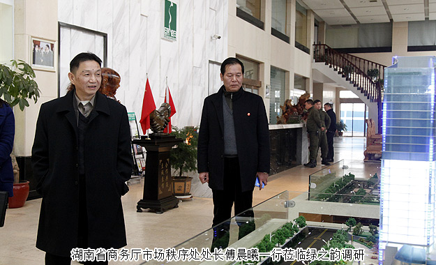 2016年1月13日,湖南省商務(wù)廳市場秩序處處長傅晨曦、副處長周建文一行蒞臨綠之韻集團(tuán)調(diào)研考察,綠之韻集團(tuán)董事長胡國安、董事執(zhí)行總裁勞嘉、外事總監(jiān)黃莎莎全程陪同。