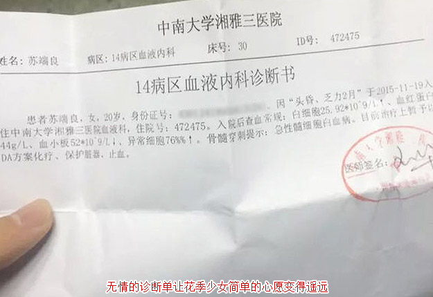 11月12日,蘇端良突然感到頭暈,便去小診所打了三天點滴。簡單治療后沒有緩解,只好又去了醫(yī)院抽血檢查。11月19日,蘇端良被朋友送到中南大學湘雅三醫(yī)院。次日,便被確診為急性髓細胞白血病。這天,工資發(fā)了下來,她剛好存夠了1萬塊,原本計劃給媽媽辦生日的錢。