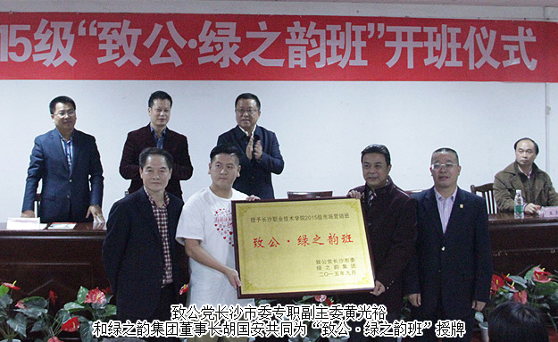 2015年11月3日,由綠之韻集團(tuán)和致公黨長(zhǎng)沙市委聯(lián)合開(kāi)辦的“致公?綠之韻班”在長(zhǎng)沙職業(yè)技術(shù)學(xué)院舉行了開(kāi)班儀式。致公黨長(zhǎng)沙市委專(zhuān)職副主委黃光裕、長(zhǎng)沙市教育局副局長(zhǎng)楊慶江、致公黨長(zhǎng)沙市委秘書(shū)長(zhǎng)梟燕等出席活動(dòng),綠之韻集團(tuán)董事長(zhǎng)胡國(guó)安,綠之韻集團(tuán)辦公室主任、工會(huì)副主席馮紅,湖南省綠之韻公益基金會(huì)秘書(shū)長(zhǎng)蔣文,綠之韻集團(tuán)團(tuán)委書(shū)記李倩婷,湖南分公司副經(jīng)理劉磊及愛(ài)心經(jīng)銷(xiāo)黃翔、李政沅、周書(shū)明等代表參加開(kāi)班儀式。長(zhǎng)沙職業(yè)技術(shù)學(xué)院黨委書(shū)記彭驚雷帶領(lǐng)學(xué)校領(lǐng)導(dǎo)班子成員和“致公?綠之韻班”50多名學(xué)生及部分教師代表參加活動(dòng)。