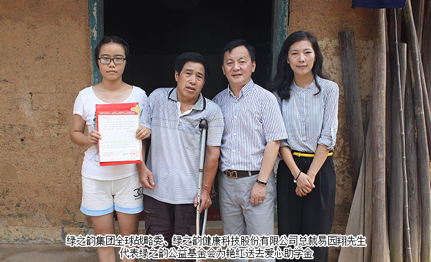 得知了驕陽的故事后,綠之韻集團董事、常務副總裁勞嘉女士代表湖南省綠之韻公益基金會送去了一萬元愛心助學金,希望驕陽可以好好學習,將來回報家人,回報社會。