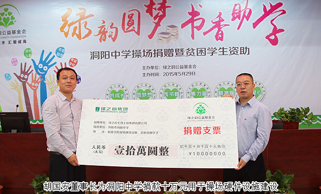 瀏陽(yáng)市洞陽(yáng)中學(xué)是綠之韻工業(yè)園希望小學(xué)的直升中學(xué),學(xué)校根據(jù)發(fā)展需要,決定更換原來(lái)的水泥操場(chǎng)為塑膠操場(chǎng)。當(dāng)?shù)弥獙W(xué)??嘤谫Y金困難,胡國(guó)安董事長(zhǎng)代表綠之韻表示,將無(wú)償為學(xué)校捐建塑膠操場(chǎng),為孩子們提供一個(gè)安全、舒適的運(yùn)動(dòng)環(huán)境,為學(xué)校全面提升辦學(xué)品位和全面實(shí)施素質(zhì)教育創(chuàng)設(shè)良好環(huán)境。捐贈(zèng)儀式上,湖南綠之韻公益基金會(huì)理事長(zhǎng)勞嘉發(fā)表致辭,她表示:少年強(qiáng)則國(guó)強(qiáng),青少年是祖國(guó)的未來(lái),為學(xué)校捐建操場(chǎng),為孩子們配備體育器材,給貧困學(xué)子給予經(jīng)濟(jì)資助,是綠之韻十二年來(lái)關(guān)注教育事業(yè)的舉措之一。綠之韻希望通過(guò)這份愛(ài)心激勵(lì)莘莘學(xué)子努力學(xué)習(xí),同時(shí)能夠起到拋磚引玉的作用,使社會(huì)更加重視知識(shí)和教育,關(guān)心人才的培養(yǎng)。她希望學(xué)子們?cè)趯W(xué)習(xí)文化知識(shí)的同時(shí)加強(qiáng)體育鍛煉,要學(xué)習(xí)好、身體好、品德好,健康快樂(lè)地成長(zhǎng),將來(lái)做對(duì)國(guó)家有用的人。
