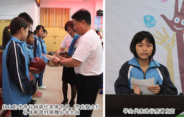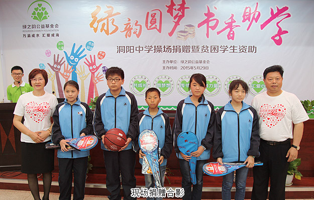2015年5月28—29日,綠之韻“綠韻圓夢(mèng)?書(shū)香助學(xué)”活動(dòng)走進(jìn)瀏陽(yáng)洞陽(yáng)中學(xué)。為了改善青少年教育教學(xué)環(huán)境,共同關(guān)注孩子們健康成長(zhǎng),活動(dòng)當(dāng)天,湖南省光彩事業(yè)促進(jìn)會(huì)副會(huì)長(zhǎng)、長(zhǎng)沙市光彩事業(yè)基金會(huì)理事長(zhǎng)、綠之韻集團(tuán)董事長(zhǎng)胡國(guó)安先生代表湖南綠之韻公益基金會(huì)向洞陽(yáng)中學(xué)捐贈(zèng)10萬(wàn)元愛(ài)心款項(xiàng)用于該校愛(ài)心操場(chǎng)的建設(shè)。28日上午,湖南綠之韻公益基金會(huì)理事長(zhǎng)、董事常務(wù)副總裁勞嘉女士與綠之韻優(yōu)秀經(jīng)銷商周書(shū)明、蘇龍輝夫婦一起走訪了學(xué)校貧困學(xué)子的家庭,并給予經(jīng)濟(jì)資助。29日,湖南綠之韻公益基金會(huì)又將一批體育器材親手送到了學(xué)生手中。綠之韻集團(tuán)黨總支部書(shū)記許達(dá)仲,湖南綠之韻公益基金執(zhí)行秘書(shū)長(zhǎng)蔣文,綠之韻集團(tuán)辦公室主任馮紅,瀏陽(yáng)經(jīng)濟(jì)開(kāi)發(fā)區(qū)團(tuán)委副書(shū)記、綠之韻集團(tuán)團(tuán)支部書(shū)記李倩婷,湖南分公司業(yè)務(wù)經(jīng)理劉磊,帶領(lǐng)綠之韻黨團(tuán)成員以及近百位愛(ài)心經(jīng)銷商參與活動(dòng)。