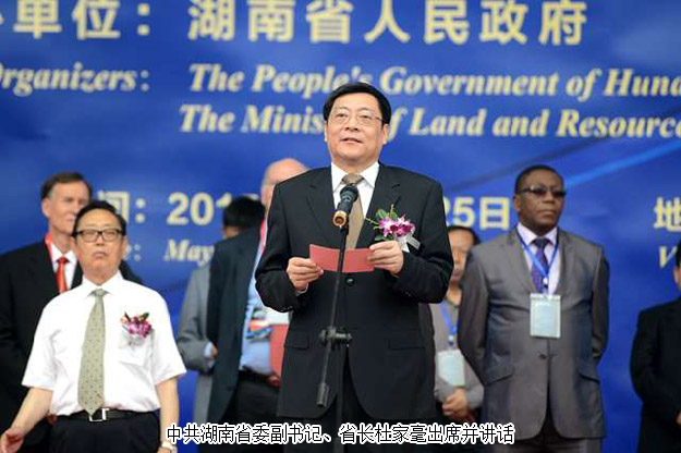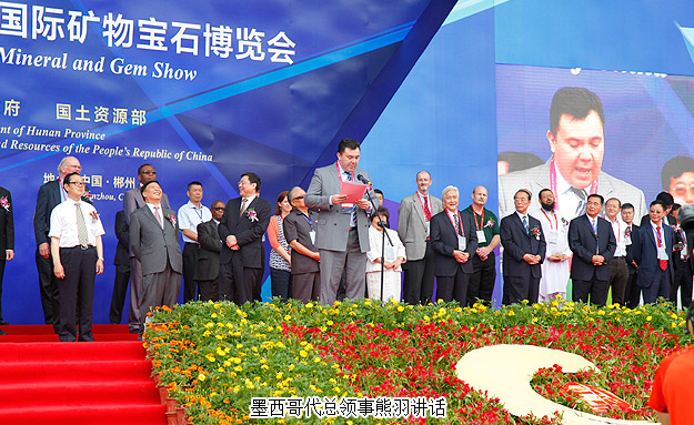 開幕式上,郴州市委書記易鵬飛、國外展商代表羅伯特?拉溫斯基、墨西哥代總領(lǐng)事熊羽分別致辭。美國圖森展原主席彼得?梅高、澳大利亞昆士蘭博物館聯(lián)盟主任蘇珊?米勒、美國著名礦物寶石收藏家基因?梅爾安等境外嘉賓,中國科學(xué)院院士莫宣學(xué),國土資源部、湖南省委、省人大、省政府、省政協(xié)領(lǐng)導(dǎo),國家相關(guān)部辦委領(lǐng)導(dǎo),礦博會組委會成員單位領(lǐng)導(dǎo),行業(yè)協(xié)會、礦山企業(yè)、參展商代表,50多家新聞媒體記者及群眾代表等參加了開幕式。