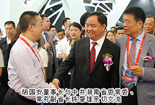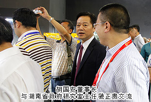 陪同領(lǐng)導(dǎo)巡館以后,胡國安董事長對本次礦博會成功舉辦高度評價:“國際礦博會的舉辦,讓‘湖南走出去’戰(zhàn)略得到了充實(shí)提升。這么多國家參展,必將吸引全世界的目光,這對于湖南文化和湖南經(jīng)濟(jì)社會來說,是一個天然的展示機(jī)會。湖南應(yīng)充分利用博覽會搭建的平臺,‘把會展與文化、旅游、科技、信息、商貿(mào)、物流更好地結(jié)合起來,著力推動會展經(jīng)濟(jì)和現(xiàn)代服務(wù)業(yè)加快發(fā)展’”。他表示:湖南地處中國中部城市要沖,無論是地理位置還是區(qū)位優(yōu)勢來看,都是屬于發(fā)展要沖,加上洞庭湖國家級生態(tài)經(jīng)濟(jì)區(qū)和長江經(jīng)濟(jì)帶的確立,更突顯了湖南的發(fā)展優(yōu)勢。推動會展經(jīng)濟(jì)發(fā)展,這是現(xiàn)代經(jīng)濟(jì)發(fā)展的一個重要支撐,如果與湖湘文化和大湘西旅游資源及商貿(mào)物流進(jìn)行融合發(fā)展,這就讓湖南經(jīng)濟(jì)具備了強(qiáng)大的內(nèi)生動力,為湖南改革開放提供了一個天然的通道和平臺。所以,我們既要關(guān)注這次郴州礦博會的盛況,更要與湖南未來的發(fā)展結(jié)合起來看,目光不限于一隅,思路才會天地闊。