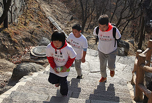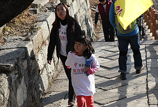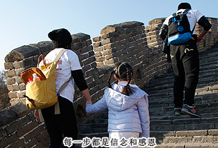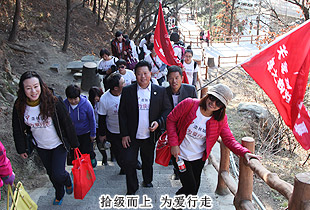 由于行進(jìn)道路比較狹窄、坡度較大,大家三五成群,從慕田峪長城入口的中華夢石城出發(fā),沿著北步道,一路意志堅(jiān)定,沿著幾里長陡峭的石階拾級而上,手拉著手歡呼雀躍地向著長城10號炮臺進(jìn)發(fā)。在這條人流中,匯聚著綠之韻愛心經(jīng)銷商、公務(wù)員、知識分子、企業(yè)老板、務(wù)工人員、學(xué)生……他們彼此并不相識,博愛的名義卻把他們緊緊連在了一起。相識的、不相識的,大家揮舞慈善紅旗,以眼神鼓勁,用微笑問候,朝著一個(gè)共同的夢想、共同的愛心、共同的追求徒步前行。共沐大愛的心靈長河,誰人又不被感動(dòng)呢?