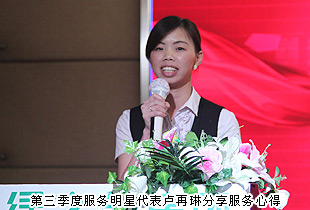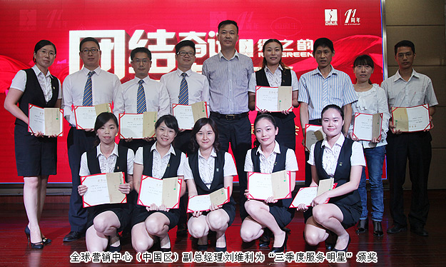 介紹了新晉高管及員工之后,會(huì)議最激動(dòng)人心的時(shí)刻還是屬于頒獎(jiǎng)環(huán)節(jié)。為表彰先進(jìn)典型,弘揚(yáng)企業(yè)文化,大會(huì)集中頒發(fā)了“三季度優(yōu)秀服務(wù)集體”、“三季度服務(wù)明星”、“五年服務(wù)英才獎(jiǎng)”、“十年服務(wù)忠誠獎(jiǎng)”等獎(jiǎng)項(xiàng)。獲獎(jiǎng)部門代表、個(gè)人依次踏上領(lǐng)獎(jiǎng)臺(tái),享受大家的聲聲祝福和熱烈掌聲,共同分享此時(shí)此刻的快樂。本次大會(huì)上,業(yè)務(wù)服務(wù)部、公共事務(wù)部、湖南分公司、保安組、日用品制作組喜獲“三季度優(yōu)秀服務(wù)集體獎(jiǎng)”,侯俊霞、陳敏、趙蕾、湛亮、楊恬、阮毅、李恒華、文冰、盧再琳、李明、伍成輝、楊會(huì)英、鄒建華、肖巧林、胡國純、胡樹峰、趙潔、費(fèi)陽、曹葉、樊俊杰榮獲“三季度服務(wù)明星”殊榮;王芬、陳敏、周洋、高芳、李明、雷竹蘭、黃付行、侯立新、黃繼民、王麗、梁涌、李哲、呂晶榮膺“五年服務(wù)英才獎(jiǎng)”,董事常務(wù)副總裁勞嘉上臺(tái)頒發(fā)了香港周大福珠寶公司特約設(shè)計(jì)師量身定做的、鐫刻獲獎(jiǎng)?wù)呙值淖憬饦s譽(yù)徽章和獎(jiǎng)金;許達(dá)仲、馮紅、黃莎莎、王艷、許鵬翔、王興良榮膺“十年服務(wù)忠誠獎(jiǎng)”,不僅收獲了全體綠之韻人的祝福和尊敬,還榮獲了60萬元購房補(bǔ)貼金、10萬元企業(yè)年金獎(jiǎng)勵(lì)金、2萬元的家庭帶薪旅游基金和由香港周大福獨(dú)家設(shè)計(jì)的金銀幣紀(jì)念獎(jiǎng)?wù)隆?/span>