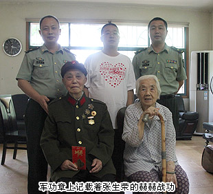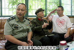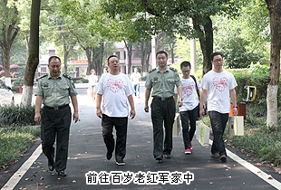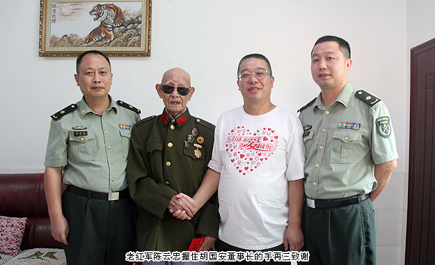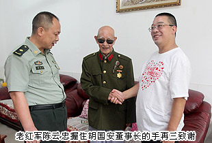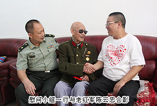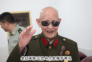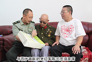 已逾百歲高齡的老紅軍陳云忠家中十分整潔,一面墻上醒目的掛著青年毛主席的肖像。談起革命往事,陳老記憶的閘門被打開,談起革命往事如數(shù)家珍。這位“飛奪瀘定橋”的幕后英雄,有一次夜行軍就磨破了一雙新鞋,他說勝利就是一步步爭取得來的??蓜e看陳老身體好,他也受過傷痛的折磨,“大傷小傷都受過,有一塊彈片在身體里呆了10多年?!?939年,陳老參加著名的黃土嶺戰(zhàn)役時,敵人的一個小鋼炮打過來,一塊彈片穿進(jìn)了他的右肩。由于醫(yī)療條件有限,陳老的肩膀當(dāng)時只進(jìn)行了一些簡單的消炎處理,這塊彈片直到1951年才取出。當(dāng)大家詢問起老人的身體時,老人舉起手來十分自豪說:“我還能自己做飯呢?!倍吹胶鷩捕麻L送上的慰問品和慰問金后,老人頗有些羞澀,感觸的說:“謝謝你們對我的關(guān)心,我一切都好!”