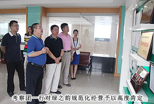 韓杰總隊(duì)長一行首先參觀了綠之韻產(chǎn)品形象展廳,了解“以傳承中華五千年中醫(yī)藥養(yǎng)生文化”為使命的綠之韻中醫(yī)藥文化淵源和脈絡(luò)。“綠色、天然、環(huán)保、健康、養(yǎng)生”的產(chǎn)品研發(fā)理念,以產(chǎn)、學(xué)、研結(jié)合為模式組建的產(chǎn)品科研團(tuán)隊(duì)都受到了韓杰總隊(duì)長的充分肯定。“為了確保產(chǎn)品的品質(zhì),我們希望能夠更為全面的控制產(chǎn)品生物鏈上的所有環(huán)節(jié),包括原料、研發(fā)、生產(chǎn)和銷售,以打造綠之韻‘全產(chǎn)業(yè)鏈條’的產(chǎn)業(yè)結(jié)構(gòu)。我們擁有五大生產(chǎn)基地,其中益陽萬畝中藥材種植基地,為我們的保健食品提供了優(yōu)質(zhì)的產(chǎn)品原料,而‘綠之韻’進(jìn)一步督促我們注重產(chǎn)品品質(zhì),因此,綠之韻先后與南京大學(xué)、湖南中醫(yī)藥大學(xué)、湖南農(nóng)業(yè)大學(xué)、南方醫(yī)科大學(xué)等科研機(jī)構(gòu)、院校展開戰(zhàn)略合作,共同服務(wù)于人類健康,全力打造‘產(chǎn)學(xué)研’成功合作典范”,綠之韻集團(tuán)董事長胡國安向考察團(tuán)一行匯報(bào)。
