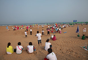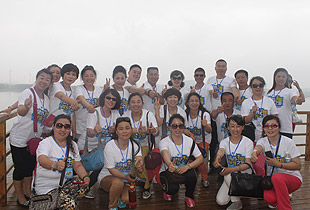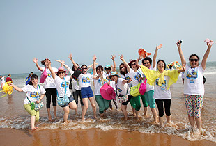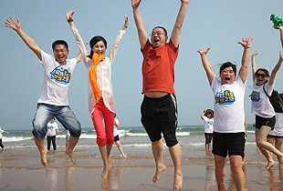 青島的海是獨一無二,享有“中國夏威夷”美譽的黃島沙灘更是令人神往不已。這不,中午時分,剛剛用完自助餐,綠之韻精英們就早已迫不及待,朝它狂奔去……在水天相接的地方,輪船一艘艘,輕舟一葉葉,白帆一點點。淺海處,身著短褲、泳衣的綠之韻精英們,男女老少,擊波游泳、踏濤沖浪,或做人體沙雕、坐摩天環(huán)車,笑聲不絕……海水、輪船、輕舟、白帆,綠之韻人和大自然構成了一副五彩斑駁的畫卷,美不勝收。累了,倦了,精英們坐在一把把五顏六色的太陽傘下,或喝飲料聊天、暢談夢想,或舉目遠眺,靜賞美景???,那些童心未泯的綠之韻精英們,有的在試圖尋找貝殼,有的在追逐嬉戲,有的在騰空留影……其樂無窮。