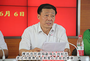 2014年6月6日,“關(guān)愛(ài)貧困母親,讓愛(ài)綻放”——中華慈善總會(huì)貧困母親救助綠之韻愛(ài)心行動(dòng)第四站走進(jìn)山東濰坊,現(xiàn)場(chǎng)為51名特困母親家庭捐贈(zèng)10多萬(wàn)元愛(ài)心善款。中華慈善總會(huì)募捐部主任蘇輝、貧困母親救助項(xiàng)目執(zhí)行主任陳富剛、濰坊市民政局局長(zhǎng)吳海源、副局長(zhǎng)劉好民等領(lǐng)導(dǎo)出席活動(dòng)。綠之韻集團(tuán)董事長(zhǎng)胡國(guó)安、綠之韻集團(tuán)全球營(yíng)銷中心(中國(guó)區(qū))市場(chǎng)行政總監(jiān)梅其慧、市場(chǎng)業(yè)務(wù)總監(jiān)曹兵、山東分公司經(jīng)理伍成輝帶領(lǐng)張吉慶、朱建昌、張美華、范桂春、馬光錄、徐繼發(fā)、王占紅、申文高等綠之韻愛(ài)心志愿者為愛(ài)行動(dòng)。