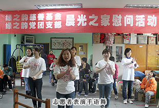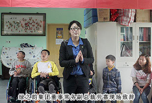 在對中心電腦課程、康復(fù)課程、語言課程等進行了解后,一行人來到一樓大廳,看望了經(jīng)過專業(yè)治療、康復(fù)訓(xùn)練,已經(jīng)能說能唱、思維接近正常孩子的兒童們??吹街驹刚叩牡絹恚⒆觽円查_心地用發(fā)音不是很準(zhǔn)的語音和大家打起了招呼,并為現(xiàn)場表演起精心準(zhǔn)備的自編自演的舞蹈來??粗⒆觽兘?jīng)過訓(xùn)練,協(xié)調(diào)而充滿韻律的舞蹈,以及臉上所透露出的幸福而滿足表情,勞嘉會心地笑了。綠之韻的志愿者們也表演了節(jié)目:手語舞“讓愛傳出去”,精彩的手語舞讓現(xiàn)場一下安靜起來。爾后,ICC長沙區(qū)域辦公室主任李明對綠之韻集團慈善基金與綠之韻黨團組織表示了衷心感謝。綠之韻集團董事常務(wù)副總裁,綠之韻慈善基金常務(wù)理事長勞嘉隨后也簡短致辭,為孩子們送上關(guān)懷與祝福。