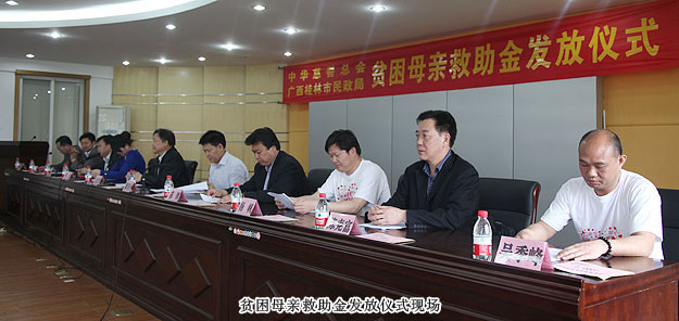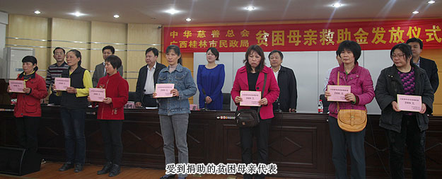 2014年4月11日,“關(guān)愛貧困母親,讓愛綻放”——中華慈善總會(huì)貧困母親救助綠之韻愛心行動(dòng)第三站走進(jìn)廣西桂林,為100名特困母親捐贈(zèng)20萬元愛心善款。中華慈善總會(huì)秘書長(zhǎng)邊志偉、募捐部主任蘇輝、廣西慈善總會(huì)常務(wù)副會(huì)長(zhǎng)陳利丹、秘書長(zhǎng)陳克富等領(lǐng)導(dǎo)出席活動(dòng)。綠之韻集團(tuán)董事常務(wù)副總裁勞嘉、全球營(yíng)銷中心華南區(qū)業(yè)務(wù)總監(jiān)兼廣東分公司經(jīng)理梁涌帶領(lǐng)吳季峰、葉海蘭、楊帆等綠之韻愛心志愿者為愛行動(dòng)。