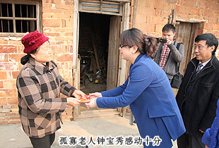 最后,慰問(wèn)小組來(lái)到的是兩位孤寡老人家,他們分別是69歲的鐘寶秀和70多歲的老黨員黃軍輝。鐘寶秀老人,本是四口之家,奈何因家族性精神病史,丈夫與兩個(gè)兒子先后離世,讓她從此孤苦無(wú)依。黃軍輝老人則是一位老共產(chǎn)黨員,曾經(jīng)還是荷花片婦女主任,如今年年被評(píng)為村里的先進(jìn)分子。老人精神很好,向慰問(wèn)組組員們一一道謝,還直言道:“你們又送錢(qián)又送東西,卻茶都不喝一口,這叫我怎么好意思!”