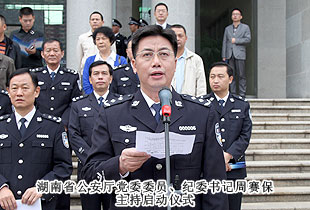 為充分展示五年來湖南省公安機(jī)關(guān)執(zhí)法規(guī)范化建設(shè)取得的成果,全面深化黨的群眾路線教育實(shí)踐活動(dòng),進(jìn)一步深入推進(jìn)規(guī)范執(zhí)法建設(shè)、和諧警民關(guān)系建設(shè),2013年10月28日上午,湖南省公安機(jī)關(guān)“規(guī)范執(zhí)法警營開放周”活動(dòng)啟動(dòng)儀式在長沙市公安局特巡警支隊(duì)院內(nèi)正式拉開帷幕。本次活動(dòng)由湖南省公安廳黨委委員、紀(jì)委書記周賽保主持。