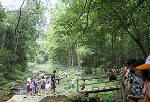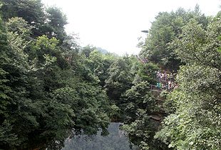 金鞭溪在張家界國(guó)家森林公園里蜿蜒流淌,因金鞭巖而得名。在“中國(guó)最美麗的大峽谷”里漫步,溪水潺潺,濃蔭蔽日,呼吸著每立方厘米中富含的8—10萬(wàn)個(gè)負(fù)氧離子,伙伴們紛紛下溪戲水,感受峽谷的靜謐和舒適。沿途游覽金鞭巖、神鷹護(hù)鞭、劈山救母等十幾處著名景點(diǎn),野猴也紛紛出來(lái)湊熱鬧,搶要伙伴們手中的食物。清澈見底、纖塵不染的碧水中,魚兒歡快地游動(dòng),紅、綠、白各色卵石在水中閃亮。陽(yáng)光透過(guò)林隙在水面灑落斑駁的影子,有詩(shī)贊曰:“清清流水青青山,山如畫屏人如仙,仙人若在畫中走,一步一望一重天?!?br/>