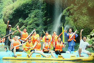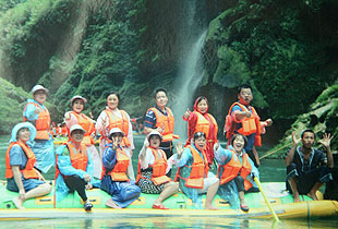 與天斗,其樂(lè)無(wú)窮;與地斗,其樂(lè)無(wú)窮;與水斗,更是其樂(lè)無(wú)窮。炙陽(yáng)高照,伙伴們對(duì)水的渴望更加強(qiáng)烈,浩浩蕩蕩前往素有“天下第一漂”美譽(yù)的猛洞河漂流,感受與水搏斗的激情和清涼。大家搶購(gòu)著水槍、水瓢、雨衣等打水仗的“武器”,懷著渴望刺激挑戰(zhàn)驚險(xiǎn)的心情互相“挑釁”,只見河中水花飛舞、水柱橫飛,還未等上船伙伴們就紛紛“濕身”了。拐一百五十五個(gè)彎,在一百三十三個(gè)灘潭中穿梭而行,兩岸怪石嶙峋,野猴出沒(méi),飛瀑激流,山與水的組合,讓所有的營(yíng)銷精英大呼過(guò)癮。