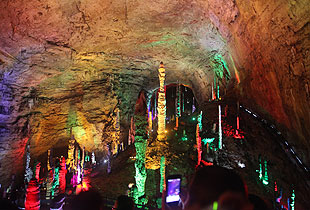 “世界溶洞全能冠軍”黃龍洞是此次張家界之旅的第一站。七月炎炎夏日,黃龍洞自然空調(diào)帶來(lái)的清涼是送給伙伴們的第一份禮物。從狹小的通道走進(jìn)去,一個(gè)繽紛神秘的世界讓所有伙伴驚嘆不已。立體的洞穴結(jié)構(gòu),超過(guò)10萬(wàn)平方米的龐大洞穴空間,寬闊的龍宮廳及數(shù)以萬(wàn)計(jì)的石筍,高大的洞穴瀑布,讓黃龍洞蜚聲海外。洞內(nèi)有1庫(kù)、2河、3潭、4瀑、13大廳、98廊,以及幾十座山峰,上千個(gè)白玉池和近萬(wàn)根石筍。由石灰質(zhì)溶液凝結(jié)而成的石鐘乳、石筍、石柱、石花、石幔、石枝、石管、石珍珠、石珊瑚等遍布其中,無(wú)所不奇,無(wú)奇不有,仿佛一座神奇的地下“魔宮”?;锇閭兇┧笤邶埼鑿d、響水河、天仙瀑、天柱街、龍宮等六大游覽區(qū),欣賞定海神針、萬(wàn)年雪松、龍王寶座、火箭升空、花果山、天仙瀑布等100多個(gè)景點(diǎn),深深陶醉在大自然神奇的懷抱里。