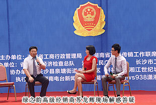 湖南省打擊傳銷工作聯(lián)席會議辦公室主任、湖南省工商局副局長魯先華,湖南省打擊傳銷工作聯(lián)席會議辦公室副主任、湖南省經(jīng)濟(jì)檢查總隊總隊長毛愛倫,湖南省經(jīng)濟(jì)檢查總隊副總隊長肖向陽,長沙市工商局黨組書記、局長卓精華,長沙市工商局黨組副書記、副局長潘虹,長沙縣人民政府副縣長、公安局長曾衛(wèi)國,長沙縣工商局黨組書記、局長舒曲等領(lǐng)導(dǎo)和嘉賓蒞臨活動現(xiàn)場指導(dǎo)。綠之韻集團(tuán)受邀參與此次活動,湖南分公司代表、高級經(jīng)銷商蘇龍輝先后與主持人、居民朋友進(jìn)行一問一答式互動,贏得了現(xiàn)場陣陣熱烈的掌聲。