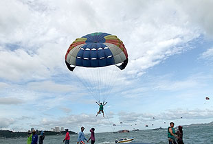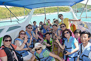 白天的芭堤雅度假區(qū)的沙灘上有各種各樣的水上活動(dòng),因?yàn)榻K年陽光普照,溫暖的海水在陽光閃爍璀璨,所以各項(xiàng)水上活動(dòng)應(yīng)有盡有。小型帆船、滑浪風(fēng)帆、滑水、淺水潛游、深水潛泳、深海釣魚等等,不但一切器材及時(shí)供應(yīng),并且還有專業(yè)的教練手把手教你。如果嫌在海灘的活動(dòng)仍未能盡興,還可以乘船出海,前往各個(gè)海島。此次綠之韻浪漫泰國之旅,綠之韻的精英們?cè)谌齻€(gè)不同的島嶼之間穿梭,感受到了這個(gè)有著“東方夏威夷”美譽(yù)的地方,確實(shí)有著非同凡響的熱度和美麗。一望無際、清澈的散發(fā)著寶石藍(lán)光芒的海,岸邊的椰樹搖曳,棟棟西洋、泰式建筑掩映其間——我們讓微微帶咸的海風(fēng)柔柔的撫摩著臉,海水輕輕地、輕輕地沖上沙灘上又退去??粗矍安┐蟮暮!⒙犞鴲偠臐?,大家無不贊嘆這個(gè)熱帶風(fēng)情十足、令人流連忘返的地方。